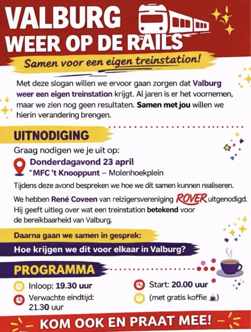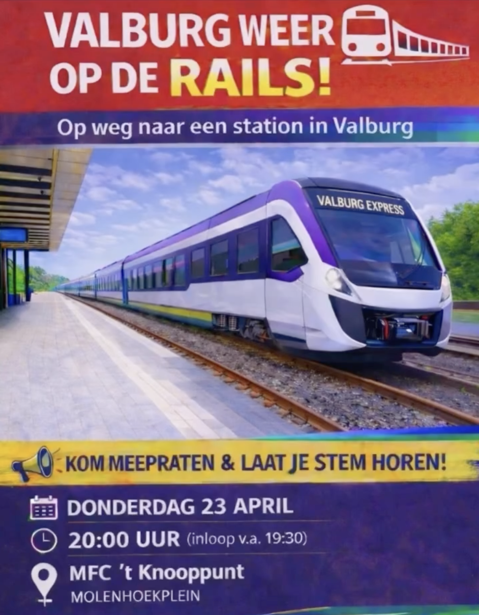 Met de slogan 'Valburg weer op de rails' wil men proberen dat Valburg weer een eigen treinstation krijgt. Al jaren is het voorgenomen, maar er is nog geen resultaat.